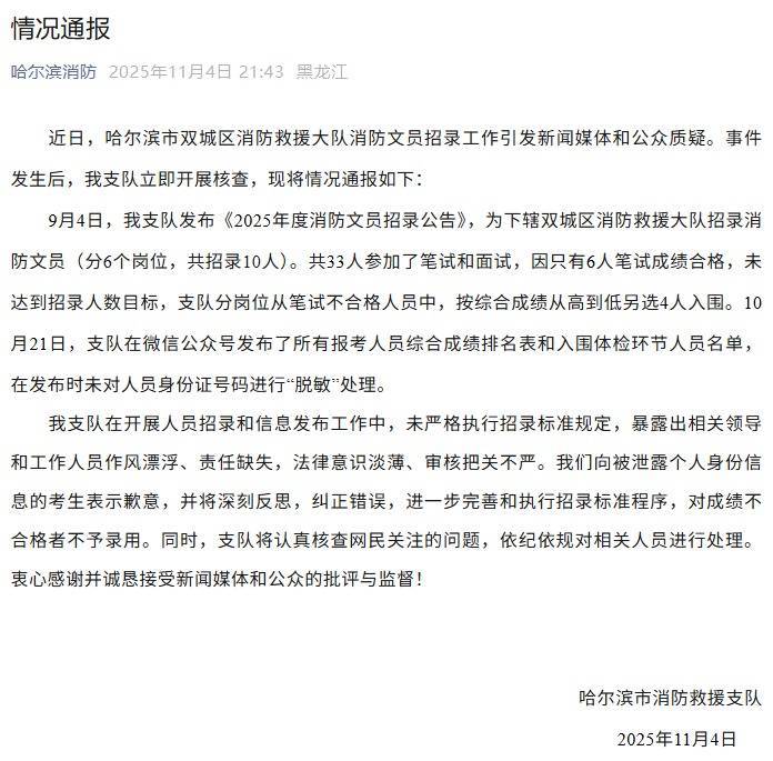11月4日晚,哈尔滨市消防救援支队发布《情况通报》称,近日,哈尔滨市双城区消防救援大队消防文员招录工作引发新闻媒体和公众质疑。事件发生后,我支队立即开展核查,现将情况通报如下: