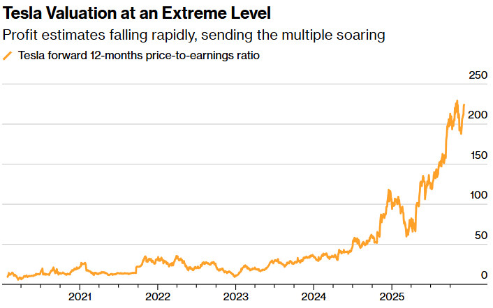 摩根士丹利将特斯拉(TSLA.US)评级下调至“持有”级别,这是自 2023 年 6 月以来的首次降级,原因是该公司估值过高。特斯拉股票的当前市盈率约为未来 12 个月预期收益的 210 倍,这使其成为标普500 指数中市值第二高的公司,仅次于市盈率为 220 倍的华纳兄弟探索(WBD.US),远远领先于排名第三的Palantir(PLTR.US)的 186 倍市盈率。